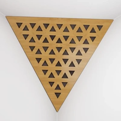 2 Pack — Ceiling Corner Bass Trap "Triangle F" Triangular Pyramid Acoustic Foam with Perforated Laminated HDF Plate and Fabric 42x42x42cm [ TRI Oak Brown ]