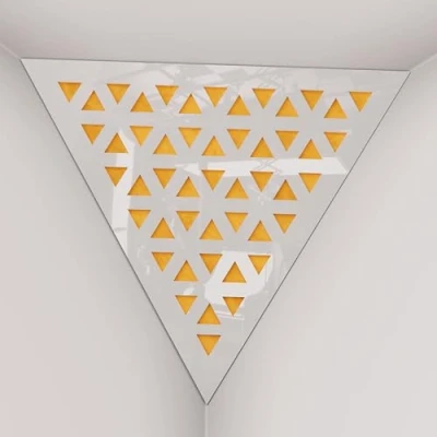 2 Pack — Ceiling Corner Bass Trap "Triangle F" Triangular Pyramid Acoustic Foam with Perforated Laminated HDF Plate and Fabric 42x42x42cm [ TRI White plastic Yellow ]