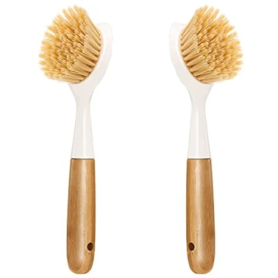 2 Pack Kitchen Dish Brush Bamboo Handle Scrubber Built in Scraper, Scrub for Pans, Pots, Sink Cleaning, Dishwashing and Cleaning Brushes are Perfect Tools, White