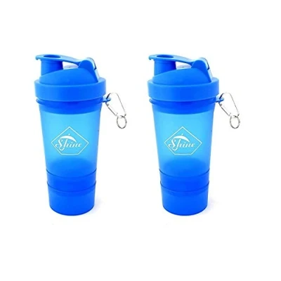 et of 2 SHINE Shakers - 450ml with 2 compartments A very useful addition to your sports and fitness accessories- this shaker features two compartments that screw on securely to the bottom of the bottle. The shaker bottle holds 450ml of fluid, the bottom compartments fit around 30g of powder and all your essential tablets. High quality plastic bottles sets of 2 in colours 2 blue, 2 black or 1 blue and 1 black Airtight lids to prevent leakage in gym bags or any spillages. Separates compartments to store dry powders and supplements
