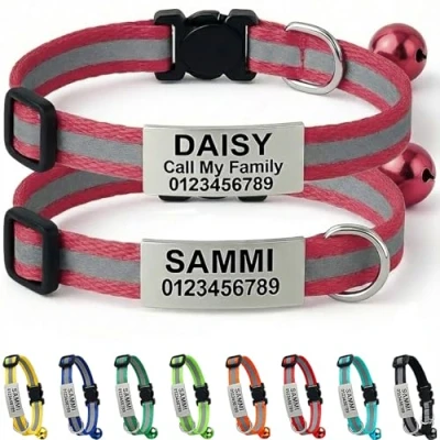 Personalised Engraving for Instant Identification - Each collar includes a built-in metal ID plate engraved with your cat's name and phone number. No dangling tags, no noise, and your details stay clear and readable for fast contact if your pet ever wanders. High-Visibility Reflective Safety Strip - The reflective band increases visibility at night by bouncing light back toward drivers, cyclists and torchlight. Helps keep adventurous outdoor cats safer in low-light conditions. Breakaway Buckle for Cat Safety - Designed with a secure quick-release buckle that opens under pressure. If your cat gets caught on a branch, fence or furniture, the collar releases to prevent injury. Fully Adjustable for Kittens and Adult Cats - Lightweight, soft and comfortable with an adjustable fit from 19-32cm. Suitable for kittens, small cats and full-grown cats without rubbing or irritation. Great Value 2-Pack for Multi-Cat Homes - Includes two personalised collars in your chosen colours. Use one as a spare, match colours to each pet, or keep an extra ready for replacements.