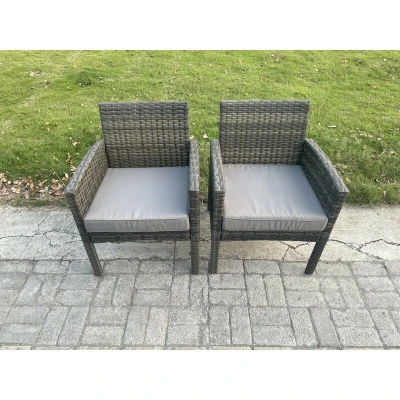 General description This classical high back 2 pcs armchair set is designed for outdoor use, featuring a comfortable and soft pillow back. Made from premium dark grey mixed rattan, it is built to withstand various British weather conditions, including rain, wind, and sun. The set includes thick, premium quality dark grey cushions with washable covers, ensuring both comfort and convenience. Technical specifications Armchair size: 58 W x 60 D x 76 H cm Seat height: 36 cm (excluding cushion thickness) Cushion thickness: 8 cm with foam Installation Items come flat packed and are easy to assemble. Usage Low maintenance required. Removable cushion covers for easy cleaning. Recommended to keep cushions indoors or use a rain cover when not in use. For long-term storage, cover the furniture with a rain cover. Other information Sturdy galvanized steel tube metal frames with powder coating to prevent rust. 1-year quality guarantee. For any assembly issues, missing parts, or product quality