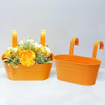 2 Pcs Metal Hanging Flower Plant Pots, Bucket Fence Bucket, Pot for Indoor and Outdoor, Storage in Kitchen or Bathroom, Detachable Hook(Orange)