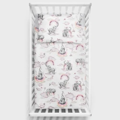 2 Piece Baby Kids Bedding Set 120x90 cm Duvet Cover & Pillowcase for Toddler Cot (Pink Elephants)
