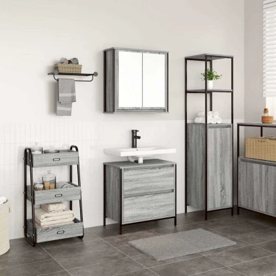 ManoManoGeneral description This stylish bathroom furniture set is an excellent addition to your bathroom, giving it a tidy and striking appearance. Made from engineered wood, it is durable and stable, with a smooth surface that is resistant to moisture, warping, and splitting. The set offers ample storage space to keep your essentials well organized and within reach. Technical specifications Colour: Grey sonoma Material: Engineered wood, steel Assembly required: Yes Bathroom basin cabinet: Overall dimensions: 60 x 34.5 x 60 cm (W x D x H) Cutout size: 8 x 22 cm (W x D) Drawer dimensions (each): 53.5 x 28.5 x 21 cm (W x D x H) One sliding drawer One gas-lift open storage compartment Overall max. weight capacity: 60 kg Max. weight capacity of tabletop: 20 kg Max. weight capacity of drawer: 5 kg Bathroom wall cabinet: Overall dimensions: 60 x 21 x 60 cm (W x D x H) Mirror size (each): 25.5 x 51 cm (W x H) Number of mirrors: 2 Overall max. weight capacity: 60 kg Max. weight capacity per shelf: