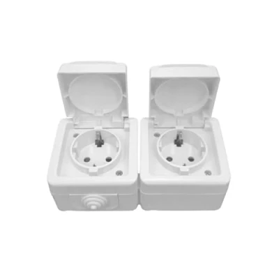 2 way surface mount plug, gray color, ideal for indoor and outdoor electrical device connection.