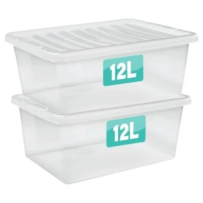 VERSATILE ORGANISATION: These Set Of 2 Boxes Ideal for any room, these storage boxes for under bed storage, or home & kitchen organisation, offer a practical way to store a variety of items, from toys to linens, ensuring your space remains tidy and organised with minimal effort. STRONG, DURABLE & BPA-FREE PLASTIC: Optimal Products Collection plastic storage boxes are proudly manufactured in Britain with premium quality polypropylene clear plastic. 100% BPA free and food safe, with no nasty smell. These clear storage boxes with lids & integrated handles provide ease of use, easier visibility & navigation MULTI-PURPOSE STORAGE FOR HOME & OFFICE: These plastic boxes with lids storage provide all round multipurpose storage solution to declutter your life. These clear plastic storage boxes are suitable for multi-purporse plastic storage containers to declutter home, office or workplace. MAXIMIZE YOUR SPACE: Our clear plastic storage box with lid (Clear) are perfect for decluttering your home, providing an efficient solution for organizing seasonal clothing, shoes, and more while keeping everything visible and accessible. HIGH GRADE & DURABLE: Our premium quality under bed storage box with lid is manufactured in Britain with polypropylene material with no nasty smells. These multipurpose sleek plastic boxes with lids storage are perfect for under bed storage. SMART DESIGN & IDEAL SIZE: The under bed box features a sleek profile that fits perfectly under most beds, allowing you to utilize otherwise wasted space while keeping your belongings safe and out of sight. Dimensions Approx: Comes as a set of 2, Each plastic box measures L38 x 26W x H16 cm, 12 litre capacity and weighs just 1.0Kg