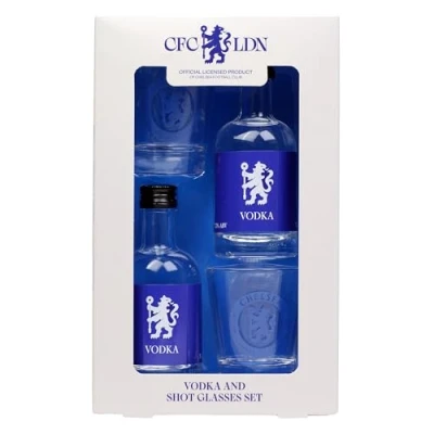 Official Chelsea F.C. vodka gift set with 2 x 5cl bottles and branded shot glasses Premium vodka (37.5% ABV) offering smooth taste, ideal for neat serves or cocktails. Licensed Chelsea merchandise — a collectible for fans and memorabilia lovers. Gift-ready format, perfect for birthdays, celebrations, or matchday gatherings. Compact design makes it easy to store, gift, or proudly display in any collection.