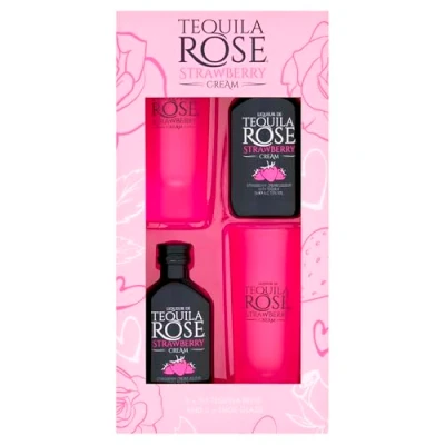2 x 5cl Tequila Rose (15% ABV) with Pink Frosted Shot Glasses