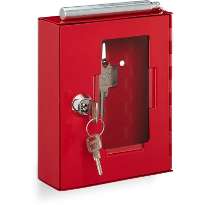 AmazonSecure: Set of 2 key boxes for emergency keys - durable metal - wall-mounted In red: Emergency key box in a bright signal colour – instantly attracts attention in an emergency. With glass panel: keys inside the box are clearly visible – panel is replaceable set of 2 with hammer: tool for breaking the emergency glass – chain for the key box Lockable: Emergency key box with cylinder lock and 2 keys – access restricted to authorised users