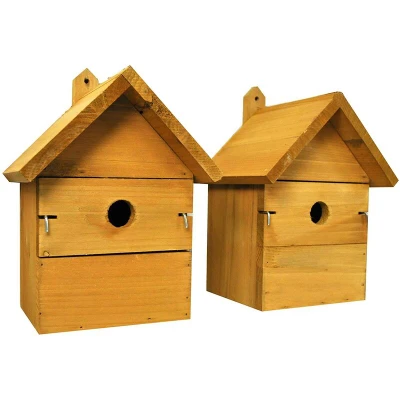General description These multi-hole nest boxes offer a one-stop solution for housing the birds that visit your garden. The entrance is interchangeable between open-fronted (perfect for Robins, Wrens, and Pied Wagtails), a 28mm hole, and a 32mm hole. Simply pop out the unneeded entrances, and the bird box is ready to provide shelter. Offering 1.5cm thick wooden walls for insulation, these birdhouses come in a great value pack of two, allowing you to position them at different vantage points. During the colder months, providing shelter for our garden visitors is essential, and these sturdy bird boxes are a perfect welcome for our feathered friends. Technical specifications Dimensions: 30cm x 20cm x 17cm Wall thickness: 1.5cm Entrance options: open-fronted, 28mm hole, 32mm hole Usage Ideal for a variety of garden birds Provides essential shelter during colder months