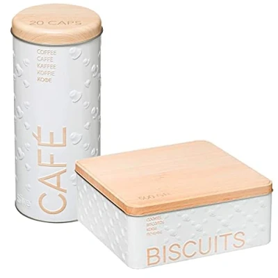 Set of 2 storage canisters for coffee capsules and cookies. Perfect pots for your kitchen giving originality to it. High quality, durable and not easy to deform. The boats are clearly labeled with their function, keep the countertop organized and save time when you need it. With their modern look they are ideal for decorating your kitchen. White