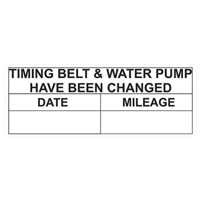 2 X Timing Belt and Water Pump Warning Stickers Made in the UK Printed on external grade vinyl this is designed to go on the OUTSIDE of the vehicle with long durability Must be applied to a clean and dry flat surface