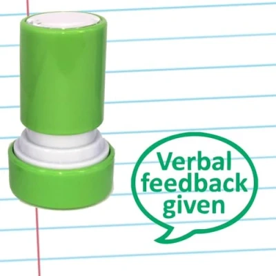 Teacher Essential: Self-inking stamp designed specifically for classroom marking and assessment, featuring 'Verbal feedback given' text in vibrant green ink Time Saving: Self-inking stamp designed specifically for teachers to efficiently mark and provide verbal feedback on student work while maintaining professional standards Quality Design: Premium 22mm stamper with refillable green ink ensures clear and consistent impressions every time Long Lasting: Durable construction guarantees thousands of crisp impressions, making it a reliable tool for daily classroom use Clear Feedback: Professional 'Verbal feedback given' message helps maintain accurate records of student-teacher interactions