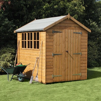 ShedstoreThe 20' x 12' Traditional Heavy Duty Apex Wooden Garden Shed (6.1m x 3.66m) is strong, long lasting and incredibly versatile, making it great for garden storage and a fantastic workshop shed or hobby room. Constructed from 12mm tongue and groove shiplap cladding, on a heavy-duty, smooth-planed 50mm x 50mm frame with diagonal cross bracing, this top-of-the-range wooden shed is most certainly built to last. The floor and apex roof are made from premium 12mm tongue and groove, the latter being fitted with a top-quality mineral felt covering to keep out the rain. A smooth-planed finish and diamond-shaped finials ensure that this heavy-duty shed isn't just robust and weathertight, but exceptionally smart and stylish too. Easy, storage-friendly access is gained via a ledged and braced door, which is fitted with zinc hinges, a door knob and rim lock to keep valuable tools and equipment secure. This door can be fitted in a variety of positions. Once inside, the shed's generous height allows plenty of headroom and increases garden storage options. Georgian-style windows provide the interior with plenty of natural light and ventilation. All of the windows are made from toughened glass. Supplied with a reassuring 1-year parts guarantee (excluding roof felt), this garden shed has been dip treated, should be re-treated within 6 weeks of assembly and annually thereafter, in order to protect the wood from rot and maintain its handsome appearance. Why not upgrade to pressure-treated? This extends the anti-rot guarantee to 15 years. PLUS, we'll upgrade the cladding to extra-thick 15mm - FOR FREE! Please be aware that the pressure treated timber still requires waterproofing upon assembly and then on an annual basis. This premium wood shed is available in a wide range of sizes. Various optional upgrades are available too, including an extra-wide door, a stable-style door, double doors, door fitted in a variety of positions, conversion of a fixed window to an opening window, no windows, a Pro Shed Base Kit, wooden floor bearers and, of course, that upgrade to pressure-treated timber. Speak to our customer service team for further details. Please note that specification measurements for cladding, floorboards and framing are nominal (before machining). As a result, there can be a variance of plus or minus 1mm on cladding and floorboards, and a plus or minus of 5mm on framing. Delivery is free to most UK addresses. 12mm tongue and groove shiplap cladding Heavy-duty, smooth-planed 50mm x 50mm frame 12mm tongue and groove floor 12mm tongue and groove roof with mineral felt covering Lockable door (can be fitted in various positions) Georgian-style windows 1-year parts guarantee Further sizes and optional upgrades available Upgrade to pressure treated for a 15-year guarantee and FREE 15mm cladding upgrade Free delivery to most UK addresses
