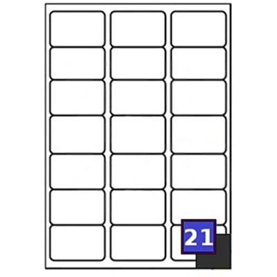 21 Labels Per Sheet 63.5 x 38.1mm Sticky Strong Self Adhesive Suitable for Both Inkjet and LaserJet printers Made from eco-friendly water based permanent adhesive Fully recyclable