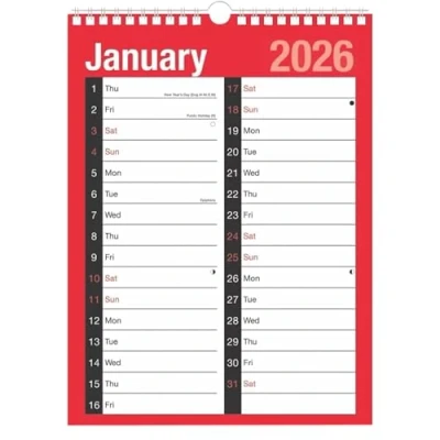 2026 2-Column Large Moth to View Wall Planner Calendar 12 Monthly Red and Black Wall Planner Runs From January 2026 - December 2026, Featuring Julian Dates and Holidays Marked. Sturdy Twin-Wire Metal Binding Allows For 360 Degree Folding Over For New Months. Ideal For Use in Home, Office, Business, School, College, University, Bank, and Many More. Each Day Box Size of Our Calendar 2026 Month to View is 15mmx 25mm Great Wall Planner Allowing You to Jot Down Notes, Thoughts, Meetings, Appointments, and Daily Activities. This Wall Calendar 2026 Month View Has a Glossy Finished and Made From Art. Spiral Bound to Flip Over and Keep Each Month in 2 Columns Paper - Pencil, Pen, and Marker Pen will Work on This Paper. 2026 A4 Extra Wide Month to View Calendar - Spiral Bound With A Hook To Hang On The Wall