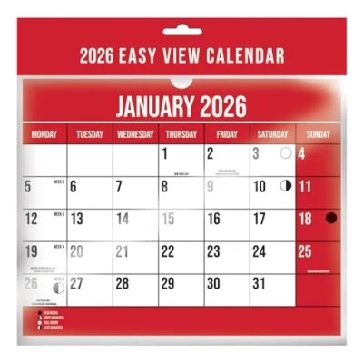 2026 One Months to view wall Calendar Size A4 12 Monthly Red and Black Wall Planner Runs from January 2026 - December 2026, featuring Julian Dates and holidays marked Sturdy Twin-Wire metal binding allows for 360 degree folding over for new months Ideal for use in home office business School, College, University Size - 252 x 244 mm approx. Matt paper for ease of writing on One sided - so no annoying bleed-through of any ink from your notes made on the other side of each page Complete 12 Month Calendar on Reverse - Ideal for Planning Very Useful Metric Coversion Table also on Reverse eg. Gallons to Litres, Metres to Feet, Kg to Lbs