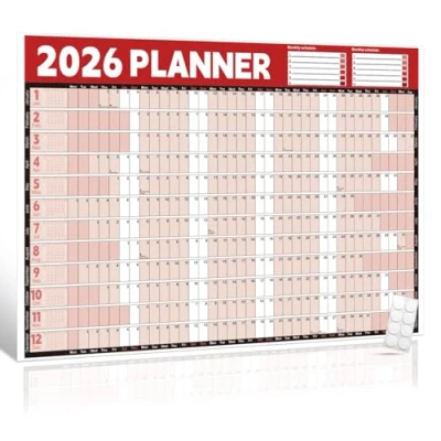 Ample Writing Space: Extra-large A1 size provides plenty of room for schedules, to-do lists, and notes. Perfect for busy families, students, and office planners Double-Sided Laminated & Wipe-Clean: Durable laminated pages on both sides allow repeated writing and easy erasing, water-resistant for long-lasting use UK Holidays & Weekend Highlights: Clearly displays all UK bank holidays and highlights weekdays for effortless yearly planning and avoiding scheduling conflicts Easy To Use: Delivered in a folded, space-saving package for better value for money. Comes with 8 round double-sided stickers for quick and secure wall mounting without tools Versatile & Stylish: Ideal for home, office, classrooms, and studios. Helps you stay organized, manage time effectively, and brighten your space with a bold red design Convenient Folded Packaging – The wall planner comes in a compact folded package, making it easy to transport, space-saving, and perfectly protected until you unpack it