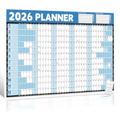 Extra-Large A1 Size for Clear Planning – See your whole year at a glance with this oversized 2026 wall planner (84.1x59.4cm). Laminated both sides for durability, it resists tears, folds, and daily wear Reusable Dry-Wipe Surface – Write, erase, and update easily with any dry wipe pen. Perfect for tracking school events, deadlines, or meetings while keeping your plans neat and adaptable all year Pre-Marked UK Bank Holidays & Terms – Includes key UK holidays (Christmas, Easter, New Year) and academic term dates. Ideal for families, students, teachers, and offices needing quick schedule reference Versatile for Home, Office & Teams – Use as a family hub in kitchens, a team planner in offices, or a study tool for students. The stylish blue/white design doubles as modern wall décor for any space Year-Round Clarity with Colour Coding – Blue backgrounds and alternating date colours make weekends, weekdays, and special events instantly visible. Simplified icons prevent clutter for quick, easy viewing Convenient Folded Packaging – The wall planner comes in a compact folded package, making it easy to transport, space-saving, and perfectly protected until you unpack it