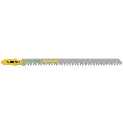 General description Festool 204262 Jigsaw Blades are designed for precision cutting in wood and fibreboard. This pack of 5 blades features sharp Japanese teeth that allow for highly accurate perpendicular cuts, ensuring clean and efficient performance. Technical specifications Material: HCS tool steel Length of cutting blade: 105 mm Pitch: 2.8 mm Max workpiece thickness: 60 mm Compatibility and accessories Compatible with Festool jigsaws: PS 300, PSB 300, PS 400, PSC 400, PSBC 400, PSB 400, PS 420, PSB 420, PSC 420, PSBC 420 Usage Ideal for straight and right-angled cutting in softer materials such as wood and fibreboard Easy saw blade replacement thanks to the T-shaft adapter Quick identification of the right saw blade using Festool's colour-coding system (yellow for wood machining)