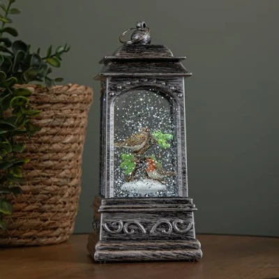 AmazonCharming Robin Scene: Features two beautifully detailed robins perched on frosted branches, capturing the peaceful essence of winter and the symbolic warmth of the season. Silver-Effect Finish: The classic silver effect frame adds a touch of timeless elegance, making it a perfect fit for both traditional and contemporary holiday decor. Swirling Glitter Effect: A built in water spinner keeps silver glitter gently swirling, creating a calming snow like motion that brings the lantern to life. Ice White LED Lighting: A crisp, cool toned ice white LED illuminates the scene, enhancing the glitters sparkle and casting a serene winter glow throughout the lantern. Dual Power Options: Operates using either 3 x AA batteries or a transformer (both not included), allowing flexible placement anywhere indoors without visible cables.