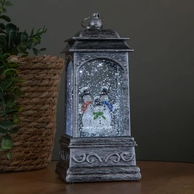 AmazonCharming Trio of Snowmen: Features three delightful snowmen in a joyful winter scene, perfect for adding warmth and personality to your festive decor. Silver-Effect Finish: The elegant silver-effect lantern frame offers a timeless look that complements both traditional and modern Christmas themes. Mesmerising Swirling Glitter: Built-in water spinner keeps silver glitter in constant motion, creating a beautiful snow like effect that brings the scene to life. Cool Ice White LED Lighting: Crisp ice white LED casts a soft, wintry glow that enhances the festive display and adds ambiance to any room. Dual Power Options: Operates with 3 x AA batteries or a transformer (both not included), giving you flexible placement without the need for trailing wires.