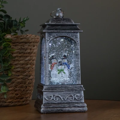 Add a frosty touch of charm to your home this winter with this 20cm Light up Christmas Water Spinner with Snowmen Scene. This compact yet eye-catching lantern is perfect for creating a magical, snow dusted atmosphere in any room, blending traditional Christmas imagery with a modern lighting effect. Whether placed on a shelf, windowsill, or mantlepiece, it’s a delightful decoration that spreads holiday cheer with every shimmer.. At the heart of this festive lantern is a whimsical scene featuring three snowmen, each adorned with scarves, all standing together in a joyful winter moment. The snowmen are surrounded by silver glitter that swirls gently in motion, The movement creates a calming, snow globe like effect that dances beautifully under the white LED light. The lantern is dual powered, use either a transformer plug (not included) or 3 x AA batteries (not included) for easy placement without worrying about plug sockets or wires.. Suitable for indoor use only.. Product Specifications. White LEDs. Height: 20cm Length: 9cm Width: 9cm. Dual Powered, Requires Transformer Plug or 3 x AA Batteries
