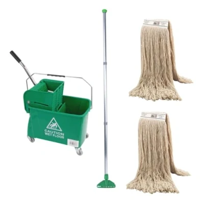 Kentucky Mop Kit Complete Includes - 20L Kentucky Mop Bucket with wringer , 2 Kentucky Mops & 137cm 3 Piece handle Convenient Design: This mop bucket features an integrated wringer, allowing you to easily wring out excess water from the mop. Mobility: Equipped with durable casters, this bucket can be easily manoeuvred from one area to another. Capacity: With a generous 20L size, this bucket can accommodate a substantial amount of cleaning solution. Safety Feature: Prominently labelled with a 'Caution Wet Floor' sign to alert others of potential slip hazards. Sturdy Construction: Crafted from high-quality materials, this mop bucket is built to withstand frequent usage