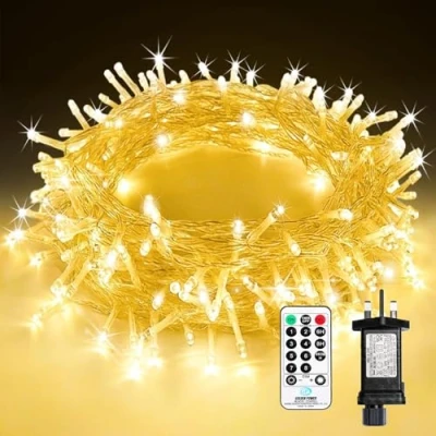【Christmas Lights Indoor】20M Christmas lights are equipped with a 5m extension cord and 200 warm white LEDs, perfect for indoor and outdoor decoration. The fairy lights with plugs improve the stability of the lamp brightness while reducing energy consumption by up to 90%! 【8 Modes & Memory Function】Combination, In waves, Sequential, Slow Glow, Chasing/Flash, Slow Fade, Twinkle/Flash and Steady On, different modes are controlled by the remote control or the button on the plug, the outdoor christmas lights have a built-in memory chip, automatically remembering the last set mode, no need to re-set. 【Expandable & Timer】Up to 3 outside christmas lights can be connected to meet the needs of various venue decorations to the greatest extent. The fairy lights for bedroom have 3 timing functions and 4 brightness levels, which you can easily adjust according to your mood. 【Safety & Waterproof】31V low voltage plug and low-temperature outdoor fairy lights are safe to touch even after long-term use, ensuring and maximizing safety. The xmas tree lights is IP65 waterproof, perfect for outdoor decoration, and low consumption. Note: Please keep the adapter away from water. 【Perfect Christmas Decorations】The warm white christmas fairy lights adopt transparent cables, which can be easily wrapped around Christmas trees, stairs, gazebos, trees, roofs, porches, etc., which are very suitable for decorating gardens, Christmas, parties, weddings, Halloween, holiday decorations.