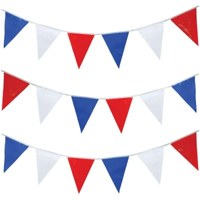 General description This red, white, and blue triangle bunting garland is perfect for celebrating British and French parties, adding a festive touch to any event. Technical specifications Total Length: 25 m Flag Colour: Red, White, Blue Material: PVC Plastic Flag Size: 20 x 30 cm Flag Count: 50 Triangle Flags