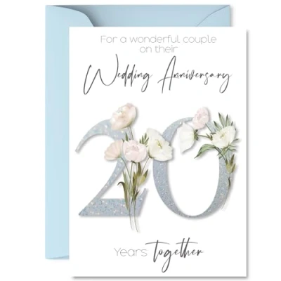 MAKE THEM SMILE WITH THIS ROMANTIC ANNIVERSARY CARD: This exceptional quality anniversary card for her or him shows the design 'For a Wonderful couple on their Wedding Anniversary 20 Years Together'. If you are looking for special anniversary greetings cards for Women anniversary card then then this happy anniversary card is bound to make them smile. Not just for anniversary gifts for Men this could also be for Girlfriend, Partner, Wife, Husband, Companion or Boyfriend. WHAT DO YOU GET: The cards are printed on both sides with the inside print saying 'Have a Lovely Day' and ample space for your own personal message. The unique fun design is printed on a specially sourced and environmentally responsible board. At 360 microns thick the natural white one-sided gloss board has a quality look and feel. Supplied with a coloured gummed envelope to complement the design and ready to be sealed and sent in the post. NO INK SMUDGES: There is nothing worse than writing inside a card to find that the shiny surface makes the ink smudge. This is why we use a high quality one sided coated board. The uncoated side will absorb more of the ink from your pen to make smudging a thing of the past. 20th anniversary card for Wife, 20th anniversary card for Husband, 20th anniversary card for Companion. SIZES: Greeting Card = 148mm x 210mm, Envelope = 150mm x 212mm, Card Thickness = 360 micron. Companion 20th anniversary card, anniversary cards for Wife, cute anniversary cards for Husband, 20th anniversary card Girlfriend, Partner 20th anniversary card. MADE AND QUALITY CHECKED IN THE UK: We print and manufacture all our products right here in the UK so you can be sure of a fast turnaround and a product that is expertly made. Using environmentally responsible premium board our card is conscious of the responsible management of the world's forests - perfect anniversary cards for Men, cute anniversary cards for her, Partner 20th anniversary cards, female anniversary cards.
