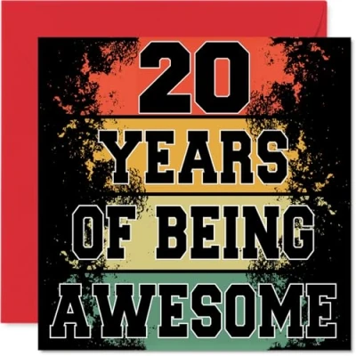 MAKE THEM SMILE WITH THIS UNIQUE BIRTHDAY CARD: This exceptional quality birthday card for him or her shows the design '20 Years Of Being Awesome'. If you are looking for special birthday greetings cards for Men birthday card then then this happy birthday card is bound to make them smile. Not just for birthday gifts for Men this could also be for Daughter, Uncle, Cousin, Sister, Friend, Auntie, Brother or Nephew. WHAT DO YOU GET: The card is printed on one side and BLANK ON THE INSIDE to allow you to write your very own message. The unique fun design is printed on a specially sourced and environmentally responsible board. At 360 microns thick the natural white one-sided gloss board has a quality look and feel. Supplied with a coloured gummed envelope to complement the design and ready to be sealed and sent in the post. Great Daughter birthday cards, Uncle birthday card. NO INK SMUDGES: There is nothing worse than writing inside a card to find that the shiny surface makes the ink smudge. This is why we use a high quality one sided coated board. The uncoated side will absorb more of the ink from your pen to make smudging a thing of the past. 20th Birthday card for Cousin, 20th Birthday card for Sister, 20th Birthday card for Friend. SIZES: Greeting Card = 145mm x 145mm, Envelope = 155mm x 155mm, Card Thickness = 360 micron. Auntie 20th birthday card, birthday cards for Brother, special birthday cards for Nephew, 20th birthday card Daughter, Uncle 20th birthday card. MADE AND QUALITY CHECKED IN THE UK: We print and manufacture all our products right here in the UK so you can be sure of a fast turnaround and a product that is expertly made. Using environmentally responsible premium board our card is conscious of the responsible management of the world's forests - perfect birthday cards for Men, fun birthday cards for him, Uncle 20th birthday cards, female birthday cards.