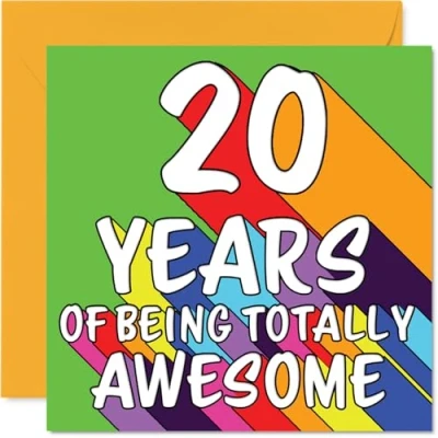 MAKE THEM SMILE WITH THIS UNIQUE BIRTHDAY CARD: This exceptional quality birthday card for him or her shows the design '20 YEARS OF BEING TOTALLY AWESOME'. If you are looking for special birthday greetings cards for Men birthday card then then this happy birthday card is bound to make them smile. Not just for birthday gifts for Men this could also be for Daughter, Uncle, Cousin, Sister, Friend, Auntie, Brother or Nephew. WHAT DO YOU GET: The card is printed on one side and BLANK ON THE INSIDE to allow you to write your very own message. The unique fun design is printed on a specially sourced and environmentally responsible board. At 360 microns thick the natural white one-sided gloss board has a quality look and feel. Supplied with a coloured gummed envelope to complement the design and ready to be sealed and sent in the post. Great Daughter birthday cards, Uncle birthday card. DESIGNED FOR WRITING: There is nothing worse than writing inside a card to find that the shiny surface makes the ink smudge. This is why we use a high quality one sided coated board. The uncoated side will absorb more of the ink from your pen to make smudging a thing of the past. 20th Birthday card for Cousin, 20th Birthday card for Sister, 20th Birthday card for Friend. SIZES: Greeting Card = 145mm x 145mm, Envelope = 155mm x 155mm, Card Thickness = 360 micron. Auntie 20th birthday card, birthday cards for Brother, special birthday cards for Nephew, 20th birthday card Daughter, Uncle 20th birthday card. MADE AND QUALITY CHECKED IN THE UK: We print and manufacture all our products right here in the UK so you can be sure of a fast turnaround and a product that is expertly made. Using environmentally responsible premium board our card is conscious of the responsible management of the world's forests - perfect birthday cards for Men, fun birthday cards for him, Uncle 20th birthday cards, female birthday cards.