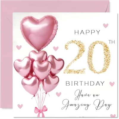 20th Birthday Cards for Women Pink Glitter Balloons Happy Card 20 Year Old Woman Friend Auntie Daughter Sister, 145mm Bday Greeting