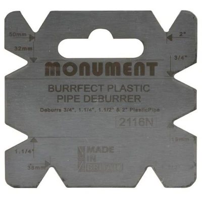 General description The MON2116N Burrfect Square Deburrer is a high-quality metal tool designed for precise metal finishing, specifically to clean and deburr plastic waste pipes of four different sizes. Its square shape features dedicated sides for deburring specific pipe diameters, making it versatile for various applications. The tool includes a practical hole for hanging storage and is made in the United Kingdom. Technical specifications Material: High-quality metal Sizes deburred: 19mm (3/4 inch), 32mm (1.1/4 inch), 38mm (1.1/2 inch), 50mm (2 inch) Shape: Square with deburring sides Compatibility and accessories Compatible with plastic waste pipes of specified sizes Includes a hanging hole for easy storage Installation No installation required; simply use the deburrer to smooth pipe edges Usage Use each side of the square to deburr pipes of the corresponding size Apply gentle pressure to remove burrs and smooth pipe edges Other information Made in the United Kingdom