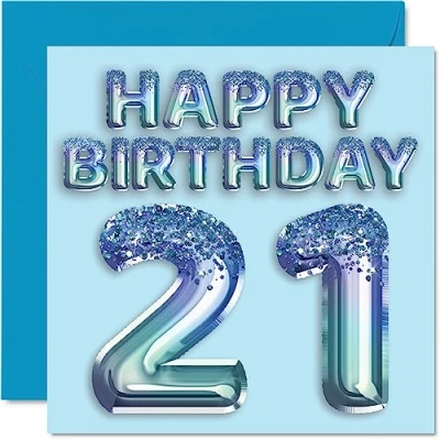 MAKE THEM SMILE WITH THIS AWESOME BIRTHDAY CARD: This exceptional quality birthday card for Him shows the design of blue glitter party balloons stating 'Happy Birthday 21'. If you are looking for funny birthday cards for Men, then then this happy birthday card is bound to make them laugh. Not just for friendship gifts for Men this could also be for Best Friend, Work Colleague, Dad, Grandpa, Nan, Dad, Grandad, Grandad, Colleague, Brother, Brother, Cousin, Uncle or Uncle. WHAT DO YOU GET: The card is printed on one side and BLANK ON THE INSIDE to allow you to write your very own message. The unique fun design is printed on a specially sourced and environmentally responsible board. At 360 microns thick the natural white one-sided gloss board has a quality look and feel. Supplied with a coloured gummed envelope to complement the design and ready to be sealed and sent in the post. Birthday card for Son, 21st birthday card for Him. NO INK SMUDGES: There is nothing worse than writing inside a card to find that the shiny surface makes the ink smudge. This is why we use a high quality one sided coated board. The uncoated side will absorb more of the ink from your pen to make smudging a thing of the past. Cousin birthday cards, Man's birthday card, birthday card cute, 21st birthday gifts for Men, 21st birthday gifts for Son, Brother birthday cards. SIZES: Greeting Card = 145mm x 145mm, Envelope = 155mm x 155mm, Card Thickness = 360 micron. Great Brother birthday cards from Sister, male birthday card, 21st birthday card, happy birthday Friend cards, Aunt 21st birthday cards, Cousin birthday card. MADE AND QUALITY CHECKED IN THE UK: We print and manufacture all our product right Him in the UK so you can be sure of a fast turnaround and a product that is expertly made. Using environmentally responsible premium board our card is conscious of the responsible management of the world's forests - Big Brother 21st birthday cards, Friends 21st birthday cards, happy male birthday cards.