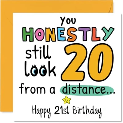 MAKE THEM SMILE WITH THIS UNIQUE BIRTHDAY CARD: This exceptional quality birthday card for him or her shows the design 'You Honestly still look 20 from a distance Happy 21st Birthday'. If you are looking for special birthday greetings cards for Men birthday card then then this happy birthday card is bound to make them smile. Not just for birthday gifts for Men this could also be for Friend, Grandson, Auntie, Granddaughter, Colleague, Brother, Nephew or Son. WHAT DO YOU GET: The card is printed on one side and BLANK ON THE INSIDE to allow you to write your very own message. The unique fun design is printed on a specially sourced and environmentally responsible board. At 360 microns thick the natural white one-sided gloss board has a quality look and feel. Supplied with a coloured gummed envelope to complement the design and ready to be sealed and sent in the post. Great Friend birthday cards, Grandson birthday card. NO INK SMUDGES: There is nothing worse than writing inside a card to find that the shiny surface makes the ink smudge. This is why we use a high quality one sided coated board. The uncoated side will absorb more of the ink from your pen to make smudging a thing of the past. 21st Birthday card for Auntie, 21st Birthday card for Granddaughter, 21st Birthday card for Colleague. SIZES: Greeting Card = 145mm x 145mm, Envelope = 155mm x 155mm, Card Thickness = 360 micron. Brother 21st birthday card, birthday cards for Nephew, special birthday cards for Son, 21st birthday card Friend, Grandson 21st birthday card. MADE AND QUALITY CHECKED IN THE UK: We print and manufacture all our products right here in the UK so you can be sure of a fast turnaround and a product that is expertly made. Using environmentally responsible premium board our card is conscious of the responsible management of the world's forests - perfect birthday cards for Men, fun birthday cards for him, Grandson 21st birthday cards, female birthday cards.