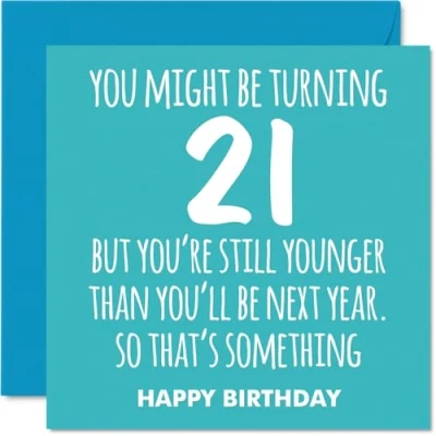 MAKE THEM SMILE WITH THIS UNIQUE BIRTHDAY CARD: This exceptional quality birthday card for him or her shows the design 'You might be turning 21 but youre still younger than youll be next year. So thats something HAPPY BIRTHDAY'. If you are looking for special birthday greetings cards for Men birthday card then this happy birthday card is bound to make them smile. Not just for birthday gifts for Men this could also be for Uncle, Cousin, Sister, Friend, Auntie, Brother, Nephew or Grandson. WHAT DO YOU GET: The card is printed on one side and BLANK ON THE INSIDE to allow you to write your very own message. The unique fun design is printed on a specially sourced and environmentally responsible board. At 360 microns thick the natural white one-sided gloss board has a quality look and feel. Supplied with a coloured gummed envelope to complement the design and ready to be sealed and sent in the post. Great Uncle birthday cards, Cousin birthday card. NO INK SMUDGES: There is nothing worse than writing inside a card to find that the shiny surface makes the ink smudge. This is why we use a high quality one sided coated board. The uncoated side will absorb more of the ink from your pen to make smudging a thing of the past. 21st Birthday card for Sister, 21st Birthday card for Friend, 21st Birthday card for Auntie. SIZES: Greeting Card = 145mm x 145mm, Envelope = 155mm x 155mm, Card Thickness = 360 micron. Brother 21st birthday card, birthday cards for Nephew, special birthday cards for Grandson, 21st birthday card Uncle, Cousin 21st birthday card. MADE AND QUALITY CHECKED IN THE UK: We print and manufacture all our products right here in the UK so you can be sure of a fast turnaround and a product that is expertly made. Using environmentally responsible premium board our card is conscious of the responsible management of the world's forests - perfect birthday cards for Men, fun birthday cards for him, Cousin 21st birthday cards, female birthday cards.