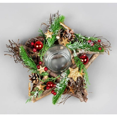 General description Wooden tealight candle holder featuring a rustic star-shaped base. This charming piece is adorned with vibrant red baubles, red berries, shimmering bronze stars, green foliage, and rustic pine cones, making it a perfect addition to your home decor. Technical specifications Candle holder dimensions: L22 x W22 x H6 cm Candle cup dimensions: D6.5 x H8 cm Material: Wooden base, PVC decoration, glass jar Compatibility and accessories Match with other decorations available in the same range Other information Candles not included