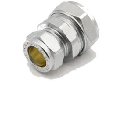 This reducing coupler has compression ends and is chrome plated. It is suitable for hot and cold-water services, including heating installations in domestic applications. Available in a range of sizes. A Compression Reducing Coupler is a plumbing fitting designed to securely and leak-proof connect pipes of different sizes without the need for soldering or welding. It uses compression technology, where a nut and ferrule (small ring) are tightened around the pipes to form a tight seal. These couplers are commonly used in water supply systems, gas lines, and other applications requiring a reduction in pipe size.. JTM Chrome Compression Reducing Coupler - 22mm x 15mm Brass Chrome Plated
