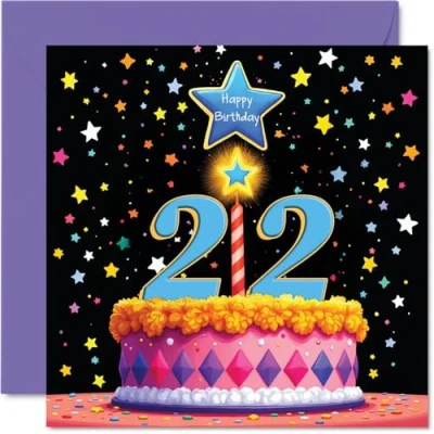 22nd Birthday Cards for Men Women Pink Cake & Stars Happy Card 22 Year Old Man Woman Cousin Son Auntie Grandson, 145mm Bday Greeting
