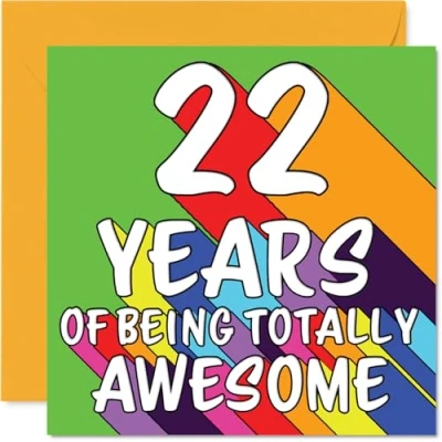 MAKE THEM SMILE WITH THIS UNIQUE BIRTHDAY CARD: This exceptional quality birthday card for him or her shows the design '22 YEARS OF BEING TOTALLY AWESOME'. If you are looking for special birthday greetings cards for Men birthday card then then this happy birthday card is bound to make them smile. Not just for birthday gifts for Men this could also be for Cousin, Sister, Friend, Auntie, Brother, Nephew, Grandson or Colleague. WHAT DO YOU GET: The card is printed on one side and BLANK ON THE INSIDE to allow you to write your very own message. The unique fun design is printed on a specially sourced and environmentally responsible board. At 360 microns thick the natural white one-sided gloss board has a quality look and feel. Supplied with a coloured gummed envelope to complement the design and ready to be sealed and sent in the post. Great Cousin birthday cards, Sister birthday card. DESIGNED FOR WRITING: There is nothing worse than writing inside a card to find that the shiny surface makes the ink smudge. This is why we use a high quality one sided coated board. The uncoated side will absorb more of the ink from your pen to make smudging a thing of the past. 22nd Birthday card for Friend, 22nd Birthday card for Auntie, 22nd Birthday card for Brother. SIZES: Greeting Card = 145mm x 145mm, Envelope = 155mm x 155mm, Card Thickness = 360 micron. Nephew 22nd birthday card, birthday cards for Grandson, special birthday cards for Colleague, 22nd birthday card Cousin, Sister 22nd birthday card. MADE AND QUALITY CHECKED IN THE UK: We print and manufacture all our products right here in the UK so you can be sure of a fast turnaround and a product that is expertly made. Using environmentally responsible premium board our card is conscious of the responsible management of the world's forests - perfect birthday cards for Men, fun birthday cards for him, Sister 22nd birthday cards, female birthday cards.