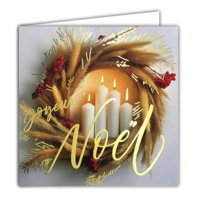 23088 Square Card Merry Christmas Shiny Gold with White Envelope Size 15 x cm Wreath of Red Berries Grasses and 4 Lighted Advent Candles Interior Made in France