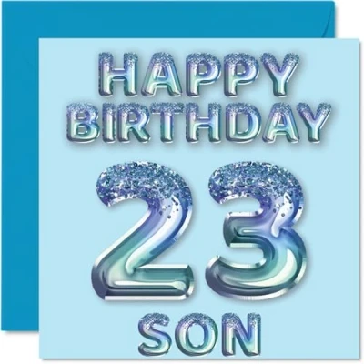 MAKE YOUR SON SMILE WITH THIS AWESOME BIRTHDAY CARD: This exceptional quality birthday card for him shows the design of blue glitter balloons stating 'Happy Birthday 23' Son'. If you are looking for funny birthday cards for men, then then this happy birthday card is bound to make them laugh. Not just for friendship gifts for men this could also be for Son, Step Son or Son in Law. WHAT DO YOU GET: The card is printed on one side and BLANK ON THE INSIDE to allow you to write your very own message. The unique fun design is printed on a specially sourced and environmentally responsible board. At 360 microns thick the natural white one-sided gloss board has a quality look and feel. Supplied with a coloured gummed envelope to complement the design and ready to be sealed and sent in the post. Birthday card for Son, 23rd birthday card for him. NO INK SMUDGES: There is nothing worse than writing inside a card to find that the shiny surface makes the ink smudge. This is why we use a high quality one sided coated board. The uncoated side will absorb more of the ink from your pen to make smudging a thing of the past. Son birthday cards, birthday card cute, 23rd birthday gifts for Son, Son birthday cards. SIZES: Greeting Card = 145mm x 145mm, Envelope = 155mm x 155mm, Card Thickness = 360 micron. Great Son birthday cards from Dad and Mum, male birthday card, 23rd birthday card, happy birthday Son cards, family birthday card. MADE AND QUALITY CHECKED IN THE UK: We print and manufacture all our product right her in the UK so you can be sure of a fast turnaround and a product that is expertly made. Using environmentally responsible premium board our card is conscious of the responsible management of the world's forests.