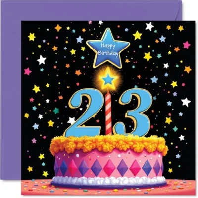 23rd Birthday Cards for Women Men Pink Cake & Stars Happy Card 23 Year Old Woman Man Son Colleague Cousin Auntie, 145mm Bday Greeting
