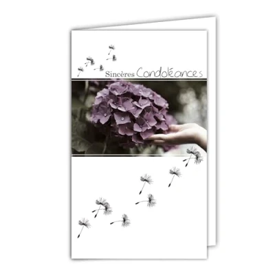 24 1006 A Sincere Sympathy Card with White Envelope 10 x 16.5 cm Flower Hydrangea Purple Dandelion Seeds Modern Contemporary Design Clean Grey Silver Shiny Mourning Death