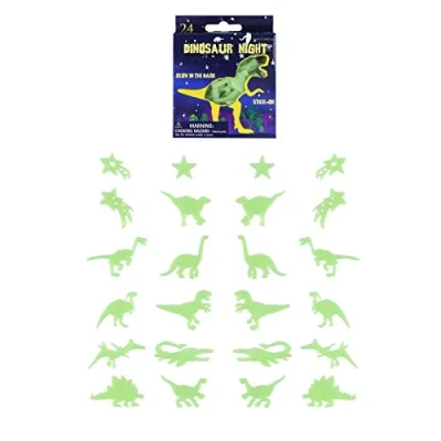 π FEELS LIKE BEING IN THE JURASSIC PARK! - Create an awesome dinosaur night time display for your little one to enjoy. This set of assorted glowing dinos includes carnivores, herbivores, swimmers and fliers! CHARGING UNLIMITED: No batteries required. Glows for 8 hours every night. The vinyl absorbs light during the day and releases its stored light when the lights are out. On a full charge they will glow overnight. Lightbulbs can charge them but sunlight is best β΄ 24 Pcs MAGICAL GLOW IN THE DARK WALL STICKERS SET - This set of 24 pieces comes with the right size stickers which makes it really easy to apply to walls & ceilings. Only needs a minute of exposure to light before they will glow in the dark. Glow in the Dark 3D shapes can light up for 6-10 hours when they have absorbed the light for 20 minutes. Supplied in a pretty box they are ideal for stocking fillers, presents and you could even pop them into a party bag for a really special gift! π CHANGE HOME ATMOSPHERE β With this fantastic bright dinosaur decoration set you can create a great atmosphere in your children's nursery room. These are great wall stickers walls & ceilings and will create a magical educational atmosphere with the lights on or off. This set includes various types of Dinosaurs, a few shooting stars and normal stars too! These dinos will bring a smile to kids of all ages. Sizes range from 3.5 inches to 4 inches. 24 pieces per box. Box Size: 9 x 11 x 2 cm β¨ CREATE A BEAUTIFUL SENSORY SCENE - These glow in the dark ceiling sticker shapes will bring back Dinosaurs into your own home. It helps your child fall asleep and make your child less afraid of the dark. Each set contains 24 pretty 3D shapes with sticky dot adhesives. These wonβt crumple, crease or tear, you simply add a dot and apply to the surface, and not just walls β you can stick these virtually anywhere! π 100% SAFE & NON TOXIC MATERIAL & YOU CAN USE ON ANY SURFACE - Waterproof PVC, Non-Toxic, Eco-friendly Material. Safe for kids. There will be no damage while you are applying or removing the glow in the dark wall stickers. The Glow in the Dark Wall stickers are reusable. You can remove and reapply them whenever you wish. No marks will be left on any dry, smooth, dust free surface. You can use hair dryer to make removal easier!