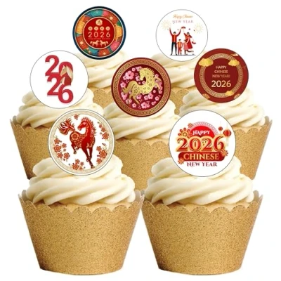 24 Precut Round Edible wafer Chinese New Year 2026 Cupcake toppers You will receive toppers exactly as shown in the photo - Pre-Cut and ready to place straight on your cakes Year Of The Horse Chinese New Year themed edible cake toppers - perfect for parties and celebrations Precut out for you in 4cm circles and ready to place straight on your cakes Fully edible, printed with edible inks- Ingredients = Water, Sunflower Oil and Potato Starch