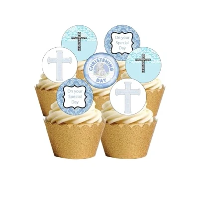 24 Precut Round Edible Wafer Paper Christening Baby Boy Toppers Decorations